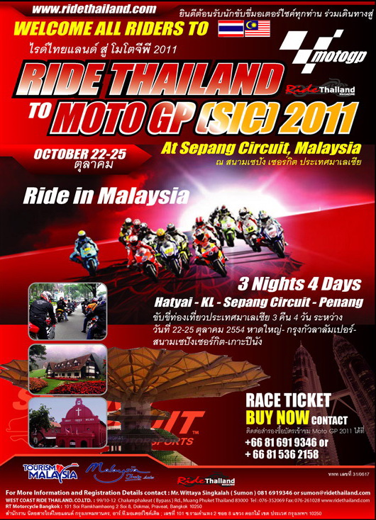 ยินดีต้อนรับนักขับขี่มอเตอร์ไซค์ทุกท่าน ร่วมเดินทางสู่ "Ride Thailand to Moto GP (SIC) 2011" ณ สนามเซปัง เซอร์กิต ประเทศมาเลเซีย