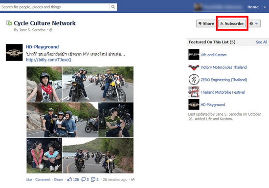 จากนั้นกดปุ่ม Subscribe บริเวณขวามือด้านบน (วิธีการดูจากรูปด้านล่าง) ซึ่งหลังจากกดเรียบร้อยแล้ว ในการเข้าครั้งต่อไปก็สามารถเลือกจากปุ่มใช้งานฝั่งซ้าย ในโซน Interests --> Cycle Culture Network ซึ่งจะรวบรวมข่าวสารในเครือ Cycle Culture ทั้งหมดให้ทุกท่านได้ติดตามโดยไม่พลาดอีกต่อไป