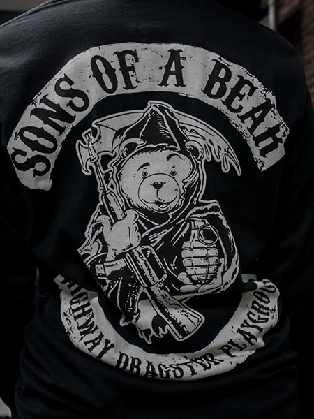 "Sons of a Bear" เสื้อยืดที่ได้รับแรงบันดาลใจมาจากซีรี่ส์เรื่องดังขวัญใจของเหล่าไบค์เกอร์อย่าง Son of Anarchy โดยนำมาเพิ่มความสนุกสนานด้วยดีไซน์ที่สอดแทรกอารมณ์ขันเพื่อให้เข้ากับบรรยากาศในการขับขี่สไตล์ไทย ๆ ที่เป็นไปอย่างถ้อยทีถ้อยอาศัยและเป็นมิตร :: รายละเอียด :: สี : Black ราคา : แขนสั้น 400 บาท | แขนยาว 450 บาท ผลิตจาก : Cotton 100% ไซซ์ : F, S, M, L, XL, XXL